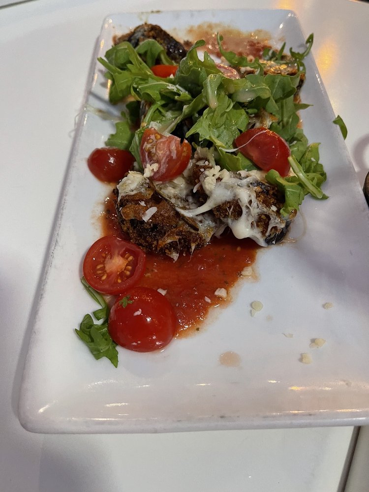 breaded eggplant with tomato sauce, arugula and mozzarella cheese